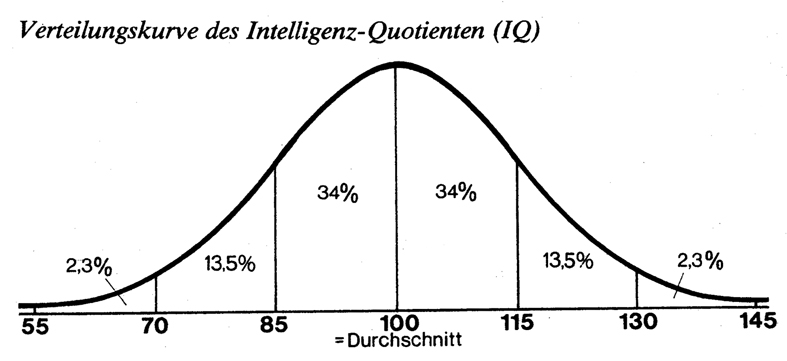 DIE GANZE IQ-KONTROVERSE versteht leider nicht, wer nicht wenigstens einen ungefähren Begriff hat, was eine 'Korrelation' ist und was Psychologie, Soziologie, Pädagogik und Verhaltensgenetik damit anfangen können. Eine Korrelation, so steht es im Wörterbuch, ist eine Wechselbeziehung. Das ist richtig, aber die Definition ist so nichtssagend, daß sie den Ausflug ins Vorfeld der statistischen Mathematik nicht erspart. Die Korrelationsrechnung vergleicht zwei unabhängig voneinander variierende Merkmale: Sie stellt damit die Variabilität beider Merkmale fest. Zum Beispiel: Lebensalter und Bauchumfang. Sie fragt, ob zwischen diesen beiden eine Beziehung zu entdecken ist, und wenn, wie diese sich in einer einzigen Zahl ausdrücken ließe. Sie sammelt also in einer bestimmten Gruppe von "Probanden", für die und nur die ihre Aussagen dann gelten, zwei Reihen von Meßwerten: eine für die Bauchweite, eine andere fürs Alter. Wenn in jedem Alter gleich häufig sämtliche Bauchweiten festgestellt werden sollten, folgt daraus, daß Alter und Leibesumfang nichts miteinander zu tun haben, daß sie unabhängig voneinander variieren, daß nichts als der Zufall bestimmt, ob einer in einem bestimmten Alter den Bauch hat, den er hat. Es besteht in diesem Fall also keinerlei Korrelation zwischen beiden Merkmalen. In unserer Zivilisation würde sich wahrscheinlich herausstellen, daß Ältere häufig dicker sind als Jüngere. In diesem Fall spricht man von einer positiven Korrelation. In einer anderen Kultur, die ihre Alten hungern läßt oder in der die Alten aus biologischen Gründen zur Ausmergelung neigen, korrelierten Alter und Leibesumfang ebenfalls, aber negativ: je älter, desto dünner. Den Grad der gemeinsamen Variation von zwei solchen Merkmalen drückt man in einer Zahl aus, dem Korrelationskoeffizienten. Null bedeutet: keine Korrelation, reiner Zufall. +1: perfekte positive Korrelation ‒ in genau dem gleichen Grad, in dem sich das eine Merkmal verändert, verändert sich auch das andere. -1: perfekte negative Korrelation. Die Wippe ist ein anschauliches Beispiel für einen Korrelationskoeffizienten von -1: In genau dem gleichen Maß, in dem sich das eine Ende von der Erde entfernt, nähert sich ihr das andere. Die meisten Korrelationen sind weniger offensichtliche und perfekte Zusammenhänge. Es sind Dezimalbrüche zwischen -1 und +1. Theoretisch wäre es möglich, alle möglichen Merkmale auf diese Weise zu vergleichen. Im Frühling ist es wärmer geworden; im Frühling sind auch die Preise gestiegen. Es ergäbe sich also mit Sicherheit eine Korrelation zwischen Lufttemperatur und Preisniveau, und zwar eine positive. Aber sie wäre absurd: Die Korrelationsrechnung hat nur Sinn, wenn beide Merkmale in einem nachweislichen Zusammenhang stehen, sei es, daß das eine von dem anderen (mit)verursacht ist, sei es, daß beide auf ein und dieselbe Ursache zurückgehen. Über die Art dieses Zusammenhangs sagt die Korrelation selbst rein gar nichts aus. Es ist ihr auch nicht anzusehen, ob Merkmal A von Merkmal B abhängig ist oder umgekehrt: ob die Frühlingstemperaturen die Preise nach oben getrieben oder die höheren Preise einem wärmeren Klima Vorschub geleistet haben. Wer Korrelationen sucht, muß damit rechnen, neben den sinnvollen auch absurde Scheinkorrelationen an den Tag zu fördern. Was aber nun heißt es, wenn zum Beispiel IQ und Schulleistung mit dem Koeffizienten 0,7 korrelieren? Ungefähr versteht man es sofort intuitiv: Es gibt da einen Zusammenhang, der irgendwo zwischen totaler Abhängigkeit der Schulleistung vom IQ und totaler Unabhängigkeit beider voneinander liegt, und zwar eher auf der höheren Seite. Aber genau? Dazu sind zwei weitere technische Begriffe nötig: 'Varianz' und 'Standardabweichung'. Man hat zum Beispiel eine Reihe von Testwerten auf dem Tisch: In einem IQ-Test hatte eine Gruppe von 5 Schülern Werte von 90, 95, 100, 105 und 110 Punkten erhalten, eine andere 75, 85, 95, 115 und 130. Wie man auf den ersten Blick sieht, sind die Ergebnisse der zweiten Gruppe breiter gestreut als die der ersten: Diese fünf Schüler sind verschiedener als die der anderen Gruppe, ihre Varianz ist größer. Die Varianz ist um so höher, je mehr Abweichungen vom Mittelwert es gibt und je höher diese ausfallen. Das läßt sich mit simpler Arithmetik fassen. Zunächst errechnet man die arithmetischen Mittelwerte. Sie liegen in beiden Gruppen genau bei 100 (a+b+c+d+e, geteilt durch 5). Dann berechnet man den Abstand der Einzelwerte zum Mittel, multipliziert jede dieser Differenzen mit sich selbst, addiert die so erhaltenen Werte und dividiert die Summe durch die Zahl der in die Rechnung eingegangenen Einzelfälle. So ergibt sich bei der ersten Gruppe eine Varianz von 50 (103+52+0+52+102 = 250 : 5), bei der zweiten von 400. Für viele Zwecke würde die Bezifferung der Varianz reichen. Aber es sind unhandlich große Zahlen. Um sie handlicher zu machen, ohne ihre Aussagekraft zu verwischen, zieht man aus ihnen die Quadratwurzel ‒ und erhält jene Größe, mit der auch in der ganzen IQ-Literatur ständig hantiert wird, die Standardabweichung. Sie gibt an, wie weit in einer Gruppe die Einzelwerte um den Mittelwert gestreut sind, und bildet somit die Meßzahl für die in einer Gruppe vorhandene Varianz. Bei der ersten Gruppe beträgt die Standardabweichung 7,07, bei der zweiten 20. Die Standardabweichung bietet einen rechnerischen Vorteil. Bei sämtlichen Normalverteilungen (egal wovon) umfassen die erste Standardabweichung über und die erste unter dem Mittelwert je 34 Prozent der Fälle; die zweite Standardabweichung weitere 13,5 Prozent; die dritte 2,3 Prozent. Die Standardabweichungen -3 bis +3 umspannen also 99,7 der Fälle. Bei der IQ-Verteilung sind die Tests so eingerichtet, dass jede Standardabweichung 15 IQ-Punkte umspannt. Woraus folgt: 68 Prozent der Bevölkerung, für die ein IQ-Test standardisiert wurde, haben einen IQ zwischen 85 und 115.