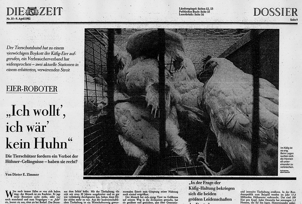 DIE ZEIT/Dossier, Nr.15, 15.April 1982, S.9-12 Titel: „Ich wollt’, ich wär’ kein Huhn – Die Tierschützer fordern ein Verbot der Hühner-Gefängnisse – haben sie recht?“ © 1982 DIE ZEIT und Dieter E. Zimmer