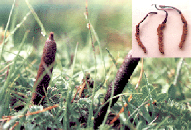 So to my dismay one propitious solution had only led to the next mystery. This is where the Internet comes in. I was spending a few days at Lake Tahoe skiing, there was a stormy day with the mountain of Heavenly closed, and I was in bad humor because there were no bookstores or libraries anywhere around where I could have pursued my study of the roots of rhubarb and other urgent problems. As I sat in my motel room with nothing to do, I thought I might as well go online and try the Web. At that time it was not yet easy to hook up your laptop to a motel phone line. When I had made it work, I first looked up all I could find about rhubarb. There was plenty, but nothing about any peculiar roots. Then I searched for the Latin name Pratt gave. There was no plant genus by the name of Sphaeria, but there were dozens of plants called sinensis. As genus names have been switched frequently, Sphaeria might have been just one of the many obsolete names that had not made it into the Internet yet. But unfortunately no sinensis species held any promise. None of them had anything to do with rhubarb. As was to be expected, the Chinese name in Pratt’s quaint old spelling brought no results either. After a few hours of this, I was about to give up and shut down the computer. Then I thought again. Search engines willy-nilly go for strings of characters completely oblivious of their meaning. By human standards, the method seems utterly stupid. We always search for meanings, not for letters. But it is exactly this stupidity that makes search engines ignore the boundaries of nature and the firm categories of human knowledge that sometimes hem us in. They are more uncompromisingly associative than we ever permit ourselves to be. When typing in the keywords ‘sinensis’ and ‘caterpillar,’ I had noticed a few pages coming up which I had considered irrelevant because they dealt not with any plant but with some fungus. So I opened the lid of my notebook again to have a closer look at that fungus. And right away there it was, Cordyceps sinensis, a medicinal fungus much prized in China, Dong Chong Xia Cao or simply Chong Cao in Pinyin spelling, meaning ‘winter-worm summer-grass.’ Its root does not mimic a caterpillar, it actually is the carcass of one. The fungus infests the caterpillars of a certain unprepossessing genus of ghost moths (Hepialus) during their underground life, kills them, devours them and grows out of them like a stalk of brown grass.
