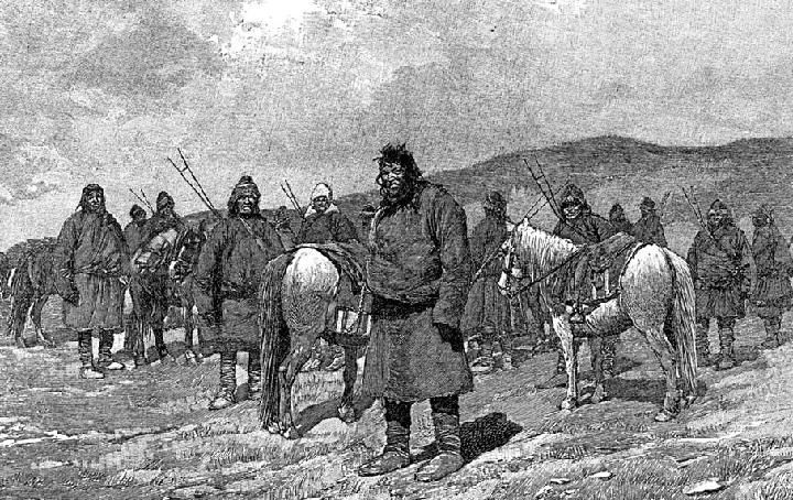 Kopf“ (Huc) – bewaffnete tibetische Reiter, nach einem Foto von Prinz