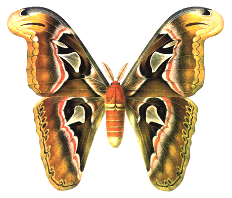 Attacus atlas Linnaeus, 1758 [Saturniidae]: this is the insect which Sleptsov witnesses breaking its cocoon. It is one the largest Lepidoptera in the world, with a wingspan of up to 240 mm (see also under »Troides). Its wings are patterned in many shades of brown, with a translucent triangular patch on each wing. The wingtips are strongly curved, forming a "Snake's Head" and earning the moth the name 'Cobra' in Italy. It also might be the most short-lived of moths. The adult is not equipped for eating at all and lives only as long as the fat reserves last that its huge green caterpillar (up to 120 mm long, up to 20 mm in diameter) has amassed – which is around twelve days. Its range is India and all of tropical SE Asia, up to China. The exhibition of Nabokov's Lepidoptera at the Museo di Storia Naturale in Milano (1992) offered an alternative: Archaeoattacus edwardsi(i) White, 1859. This is a close relative, but with a wingspan of up to 240 mm not quite as huge as atlas and more distinctly marked, with rich browns, magentas and tans. Its range is much smaller than that of atlas. In fact, it is restricted to moist and inaccessible valleys of the Himalayas. Thus it is not likely to be found fluttering "birdlike, around lamps in the Indian dusk". For this reason, and for reasons of size, I think it is atlas rather than edwardsi what Nabokov here had in mind. The caterpillars of both moths, however, are great favorites with breeders. "The enormous moth which in a state of repose assumes the image of a snake looking at you" of The Gift (p. 110) might be Attacus atlas whose curved wingtips, when at rest, form what resembles a snake's head in profile. Another likely candidate is the similar Rhescyntis hippodamia Cramer, 1777, an emperor moth in Surinam and Brazil with a wingspan of up to 210 mm. Somewhat smaller is the »South American Silkmoth which also seems to employ the snake scare. However, whether the wingtips of these large moths are to fool predators into thinking they have a snake before them is doubtful. The pseudo-snakes formed by wingtips are not looking directly at the prey but sideways. There are thousands of butterflies and moths with impressive eyespots, but these as such do not have anything particularly snakelike about them but rather seem to signify 'eyes' in general, especially the eyes of big birds of prey. If particular eyes are imitated, it is the eyes of owl-like birds. In some moths of the genus »Caligo Hübner, 1819, the owl look is so pronounced that they are called 'Owls' in popular parlance. There are a number of caterpillars that clearly employ the snake scare, notably that of »Deilephila elpenor and »Papilio troilus. *Stor:Xmas 134, 136; perhaps Gift 110 & Ac: Áttacus átlas • En: Atlas Moth, Giant Atlas Silkmoth • Fr: l'atlas • Ge: Atlasspinner • It: cobra • Ru: павлиноглазка атлас & Ac: Áttacus edwárdsi • En: Edwards' Moth • Fr: l'atlas d'Edwards • Ge: Edwards' Atlasspinner