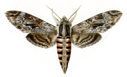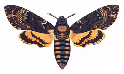 Acherontia atropos Linnaeus, 1758 [Sphingidae, Sphinginae]: this mythic creature is a large hawk moth (wingspan 80–120 mm) with a striking distinguishing mark: a sort of death's head on the back of its thorax. It migrates from Africa and SW Asia to Europe each May and June and is known to mob beehives in order to rob honey. It does not occur in America, as Poe seems to have thought. *Gift 110; SelLet 257; NabBut 199 (FB) & Ac: Acheróntia átropos • En: Death's Head Moth • Fr: le sphinx tête de mort, (Don) le sphinx atropos • Ge: Totenkopf(schwärmer) • It: testa di morto, atropo • Ru: (DarII) бражник «мертвая голова» • Sp: calavera