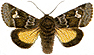 Anarta cordigera Thunberg, 1788 [Noctuidae, Noctuinae]: an owlet moth with a wingspan of 20–25 mm, typical of the tundra, but also in Europe, Asia and N America where the microclimate is tundra-like. It has a bright yellow zone on the hindwings. "Pretty Cordigera, a gemlike moth …" *SpeakM 138 & Ac: Anárta cordígera • En: Common Yellow Underwing, Small Dark Yellow Underwing, (Nabokov) Cordigera • Fr: (Autres rivages) l'Anarta Cordigera • Ge: Moorbunteule, Sumpfheidelbeerbunteule • Ru: совка пёстрая торфянниковая