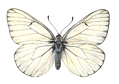 Aporia crataegi Linnaeus, 1758 [Pieridae]: a rather large white (wingspan 50 to 65 mm) distinguished by its sharp dark veins. From N Africa and W Europe (except Britain and N Fennoscandia) across Asia to Korea and Japan. In "Father's Butterflies", Nabokov wrote about a crowd of them that their "general appearance was reminiscent either of little paper cockerels or a regatta of sailboats heeling this way and that." "The blood drops noticed by ancient historians on the white walls of doomed cities …" In one of the letters to Véra, Nabokov mentions the "wonderful" Aporia crataegi augusta TURATI, 1905, a subspecies or a form Eurilio Turati had found in Sicily. *Gift 133; NabBut 211 (FB), 587 (BE); Lep1 30; Lep2 270; LtVé 51 & Ac: Apória cratáegi • En: Black-veined White • Fr: le gazé, (Don) "gazé veiné de noir" • Ge: Baumweißling, Heckenweißling • It: pieride del biancospino • Ru: белянка боярышниковая, (DarII) боярышница • Sp: blanca del majuelo