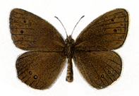 Aphantopus hyperantus Linnaeus, 1758 [Nymphalidae, Satyrinae]: a dark brown satyrine with a wingspan of 35–42 mm and a distinctive yellow-ringed eyespot near the rim of the hindwings. It is one of the most frequent butterflies on the meadows and in the light woodlands of C and N Europe and Asia, lacking around the Mediterranean. "In central Europe it prefers shady lanes and the outskirts of woods but in North Russia it is a typical denizen of open fields where it occurs in countless numbers". *Gift 133; NabBut 589–90 (BE); Lep2 270 & Ac: Aphántopus hyperántus • Am: Ringlet Wood-nymph • En: The Ringlet, (Nabokov) Aphantopus Ringlet • Fr: le tristan, (Don) "tristan chocolat • Ge: Brauner Waldvogel, Schornsteinfeger • It: tristano ² Ru: глазок цветочный, бархатница Гиперант • Sp: sortijitas