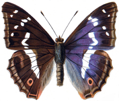 Apatura Fabricius, 1807: a very distinct genus of Nymphalidae, subfamily Apaturinae (emperors). The type-species is »Apatura iris Linnaeus, 1758. What is particular about them is that their wings are iridescent and take on different colors if looked at from different angles. The iridescence is produced by tiny air chambers in the scales. In illustrations the effect is usually rendered by giving both sides a different color. Once dead, the emperors lose their iridescence so museum specimens give only an unsufficient idea of what these large und stately butterflies look like on the wing. *NabBut 207 (FB), 575 (BE) & Ac: Apatúra • En: Purple Emperors • Fr: mars changeants • Ge: Schillerfalter • Ru: (DarII) апатуры