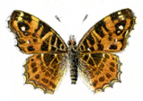Araschnia levana Linnaeus, 1758 [Nymphalidae, Nymphalinae, Nymphalini]: the only European representative of the SE Asian genus Araschnia Hübner, 1819. The range is N Spain, C and E Europe, Caucasus, C Asia to NE China, Korea and Japan. The wingspan is 32–40 mm. Below, the wings have a network of narrow white lines resembling that give it the appearance of a map. The butterfly is seasonally dimorphic. There are two broods. The spring form (Araschnia levana f. levana) is dusky-orange with black markings, the summer form (Araschnia levana f. prorsa) is maroon. "Not generally realized what a strong migrant this is. Hibernates in the chrysalid stage as far north as Leningrad. One day in the Spandau Forest (Berlin), in late July 1934 or 1935, I observed a swarm of exhausted levanas, of the summer form, resting on flowers and shrubs". *NabBut 597 (BE) & Ac: Aráschnia levána • En: Map Butterfly • Fr: la carte géographique • Ge: Landkärtchen • It: carta geografica gialla • Ru: пестрокрыльница Левана • Sp: prótea