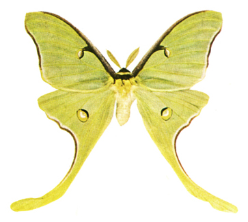 Actias luna Linnaeus, 1758 [Saturniidae]: a night-flying Emperor moth which, in human terms, might be said to look beautifully decadent. That is an impression arising when some creature has evolved very far and seemingly without purpose into one very special direction. The Luna Moth has a plump, short, furry white body and a wingspan of 75–110 mm. The wings are a very pale green with delicate yellow veins, a narrow red border and an eyespot on each wing. Its most salient feature, however, are the exaggerated and partially crumpled hindwing tails (30 mm or more). It is quite common all over N America, from Canada to Mexico. There is a close relative in SE Asia, Actias selene Hübner, 1807, with a yellowish hue and even longer tails. The only European relative is »Graellsia isabellae Graells, 1849, in Spain. *PaleF 114; StrOps 329; N/WLet #142=113old & Ac: Áctias lúna • En: Indian Moonmoth • Am: American Moon Moth • Ge: *Amerikanischer, Asiatischer Mondspinner • Ru: сатурная луна