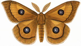 *Automeris io Fabricius, 1775 [Saturniidae]: the Io Moth, a large N American moth, with striking large black eyespots on the hindwings. The forewings of the males are yellow, those of the bigger females (with a wingspan of more than 80 mm) are brownish. The range is E of a line from North Dakota through Colorado to New Mexico. During his outing with Robert H. Boyle in Arizona, Nabokov "noted a day-flying Peacock moth. 'In quest of a female. It only quiets down at certain hours of the day. I have found them asleep on flowers.'" This could be a misunderstanding on Boyle's part. The Peacock Moth (»Saturnia pyri) does not fly in America. It is true that the Io Moth is sometimes called Peacock Moth but finding it in Arizona would have been such an unusual event that Nabokov would have made more of it. In a letter, Edmund Wilson described to Nabokov a medium-sized yellow moth with owlish eyes, asking what it might be and whether it could be an Emperor. As he is speaking of an American insect, it cannot be »Saturnia pavonia or S. spini, the European Emperor Moths. In the United States, all saturniids are called emperor moths. Wilson's description fits Automeris io. *Int1 126 (NabBut 531); N/WLet #43new, #76=64old, #147new & Ac: Autómeris ío • Am: Io Moth, Peacock Moth