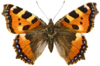 Aglais (ex Vanessa) urticae Linnaeus, 1758 [Nymphalidae]: one of the commonest butterflies of the Palearctic, flying from W Europe across Russia to Asia. The wingspan is 40–50 mm. It is reddish brown, with black, yellow and/or white marks and blue crescents along the borders of fore- and hindwings. The caterpillar feeds on nettles. It doesn't mind high altitudes and overwinters in the imago state, often in attics or the cellars of buildings. There is a description of it in Look at the Harlequins!: "'Look at that harlequin!… The creature was painted a smiling red with yellow intervals between black blotches; a row of blue crescents ran along the inside of the toothed wing margins. The only feature to rate a shiver of squeamishness was the glistening sweep of bronzy silks coming down on both sides of the beastie's body. 'As a former kindergarten teacher I can tell you,' said helpful Annette, 'that it's a most ordinary nettlefly (krapivnitsa).'" The description of the insect's hindwing in Invitation to a Beheading (p. 119) reads: "… a butterfly's orphaned hind wing, cherry-red, with a silky shading, and with blue lozenges along its crenelated edge." The crenelated edge and the blue lozenges point to Aglais urticae, »Nymphalis polychoros, the Large Tortoiseshell, or »Nymphalis xanthomelas, the Yellow-legged Tortoiseshell. They are similar in overall appearance, but the latter two are larger. Not everyone, however, would call their basic color (which is a reddish brown) 'cherry-red'. Still as Nabokov explicitly called the Small Tortoiseshell's color a "smiling red" in Look at the Harlequins!, he seems to have seen it as red. Nymphalis xanthomelas is the rarest of the three and the most distinctly patterned; it is found only in E Europe. In Ada, there is a reference to a tortoiseshell in the middle panel ("Earthly Paradise") of Hieronymus Bosch's "Garden of Delights": "… placed there as if settled on a flower – mark the 'as if,' for here we have an example of exact knowledge of the two admirable girls, because they say that actually the wrong side of the bug is shown, it should have been the underside, if seen, as it is, in profile, but Bosch evidently found a wing or two in the corner cobweb of his casement and showed the prettier upper surface in depicting his incorrectly folded insect. I mean I don't give a hoot for the esoteric meaning, for the myth behind the moth, for the masterpiece-baiter who makes Bosch express some bosh of his time, I'm allergic to allegory …" The flower the fake tortoiseshell is resting on is a blue thistlehead, and the butterfly most likely is Aglais urticae or possibly the similar but larger »Nymphalis polychloros, the Large Tortoiseshell. *Possibly InvBeh 119; Gift 109; possibly Ada 436–437; LHarl 108–109; Lep1 31; Lep2 256, 268 & Ac: Agláis urtícae • En: Small Tortoiseshell, Nettlefly • Fr: la petite tortue • Ge: Kleiner Fuchs • It: vanessa dell'ortica / orticaria • Ru: нимфа крапивы, (LHarl) крапивница • Sp: ortiguera