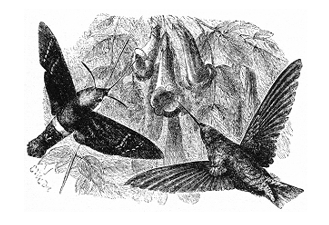 *Aellopos titan Cramer, 1777 [Sphingidae, Macroglossinae]: among the cases of mimicry or imitation mentioned in The Gift, there is a "cunning butterfly in the Brazilian forest which imitates the whir of a local bird". Which is it? There are a few butterflies that produce noises, notably those of the genus Hamadryas Hübner, 1806. They are rather large and colorful nymphalids at home in tropical S America whose males make a rapid clicking or rustling noise ("like burning pine needles") when in flight, probably to alert conspecifics of their sex. This noise is said to be most pronounced in the species fornax Hübner, 1823, belladonna Bates, 1865 on the upper Amazonas and arethusa Cramer, 1775 (En: Queen Cracker) ranging from Mexico to Bolivia. Because of it, the members of this genus are called 'Crackers' or 'Clicks' in English and 'Klappervögel' in German. However, neither can a crackling noise be called a whir, nor is it known to imitate any bird. Another possibility is that what Nabokov had in mind was the small tribe of »Brassolini in C and S America, comprising around eighty species. Its largest members belong to the C American genus Caligo Hübner, 1819 (type-species »Caligo eurilochus CRAMER, 1775), with wingspans up to 200 mm and large eyespots on the underside of their hindwings which when flourished give them a decidedly owl-like appearance, earning the Brassolini the name "Owls". Some Caligo species are pests, feeding on banana plantations. When in flight, their huge wings produce a rustling noise intended to scare off birds, yet a rustle is not quite a whir, and it is not known to imitate anything. My hypothesis is that the remark refers to a passage in Henry Walter »Bates' The Naturalist on the river Amazons with which Nabokov seems to have been thoroughly familiar (cf. Thomas »Barbour): "Several times I shot by mistake a humming-bird hawk-moth instead of a bird. This moth (Macroglossa Titan) is somewhat smaller than hummingbirds generally are; but its manner of flight, and the way it poises itself before a flower whilst probing it with its proboscis, are precisely the same actions as of humming-birds. It was only after many days' of experience that I learnt to distinguish one from the other when on the wing. This resemblance has attracted the notice of the natives, all of whom, even educated whites, firmly believe that one is transmutable into the other … But, of course, all these points of resemblance are merely superficial" (Chap. V). An etching accompanying this description depicts it along with a hummingbird. There is no imitation whatsoever involved. Hummingbirds and day-flying hawk moths have evolved their mode of flight independently and in absence of each other; what is special about it is that it enables them to fly directionally as well as to hover over a flower for nectar. They both have compact bodies and strong wings whose rapid beat (up to 70 beats per second) produces a similar whir. Aellopos titan (the generic name Macroglossa was a slight error on Bates' part) is a common day-flying hawk moth in tropical S and C America that sometimes wanders as far north as Maine and North Dakota. Its wingspan is 70 mm. It has darkish brown wings with semi-transparent white spots and a very stout dark body with a characteristic white belt in the middle, also to be seen on Bates' drawing, hence its N American name. It is the type-species of the genus Aellopos Hübner, 1819. *Gift 110 & Ac: Áellopos titán • Am: Titan Sphinx, White-banded Day Sphinx • Fr: le sphinx ceinturé