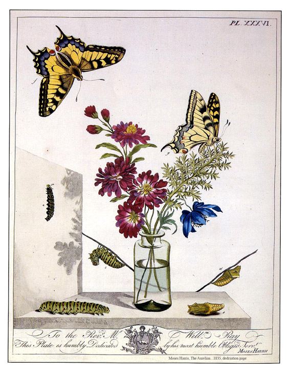 Dedication plate from The Aurelian (1766), showing two Swallowtails and their caterpillars and chrysalides
