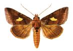 Autographa (ex Plusia) bractea Denis & Schiffermüller, 1775 [Noctuidae, Plusiinae]: a Palearctic owlet moth marked with a leaf-like silver or golden spot on the brown forewings, ranging from England across Europe and Asia to Japan. The wingspan is 27–42 mm. *SpeakM 134 & Ac: Autógrapha/Plúsia bráctea • En: Gold Spangle • Fr: la feuille d'or • Ge: Braune Silberfleckhöckereule, Silberblatt • Ru: металловидка золоченая