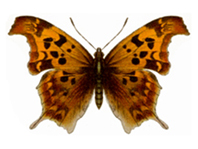 anglewing (butterfly): if not used in a broader sense, this is a butterfly of the Holarctic genus Polygonia Hübner, 1819 [Nymphalidae, Nymphalinae, Nymphalini], characterized by very ragged wing margins. & Ac: Polygónia • En: anglewing, angle-wing, angle wing, Angle-wing, Angle-wing • Ge: Zackenfalter The one in The Gift, seen in the Grunewald of Berlin, has wings of a "yellow-brown silk" and a "white bracket on its dark mottled underside". Hence it must be the Comma Butterfly, Polygonia c-album Linnaeus, 1758, with the white C of its name on the underside of the hindwings and not to be confused with »Hesperia comma Linnaeus, 1758, which is a skipper. It used to be quite frequent in W Europe from the Mediterranean region to as far north as the 66th parallel but seems to be on the decline (see »Admirable Anglewing). *Gift 332 & Ac: Polygónia c-álbum • En: Comma Butterfly • Fr: le Robert le diable • Ge: C-Falter, C-Fuchs • It: poligonia-C, vanessa c-bianco • Ru: углокрыльница цэ-белое • Sp: C-blanca The American one from the Oak Creek Canyon "has a curiously formed letter C. It mimics a chink of light through a dead leaf. Isn't that wonderful? Isn't that humorous?" This must be »Polygonia silvius W.H. Edwards, 1874. & Ac: Polygónia sílvius • Am: Sylvan Anglewing Butterflies and moths are prey to a host of predators – birds, snakes, lizards, flies, spiders, butterfly hunters and many others. One of the many protective strategies they have adopted is crypsis or camouflage. When resting, many adult species fuse with the background, looking like a piece of rock or a stretch of bark. Others resemble leaves in form and color. Some, by their way of moving, even resemble falling autumn leaves. The yellow color of the Brimstone [»Gonepteryx rhamni] which overwinters on the ground among rotting leaves and other debris probably is supposed to make it look like an innocent withered leaf. The most leaf-like butterflies, however, are a number of Asian butterflies, some members of the Neotropical genus Anaea Hübner, 1819 [Nymphalidae], and more or less all the Holarctic »tortoiseshells with their mottled undersides. In Speak, Memory (p. 125), Nabokov writes: "When a butterfly has to look like a leaf, not only are all the details of a leaf beautifully rendered but markings mimicking grub-bored holes are generously thrown in." This probably refers to the anglewing butterflies with their wildly ragged margins which make them look like brown leaves at which caterpillars have been gnawing. The impression of boreholes etc. is much more marked in the dry-leaf butterflies of the genus »Kallima Doubleday, 1849. *Gift 332; Stor:MlleO 482; SpeakM 125; Int1 129 (NabBut 534)