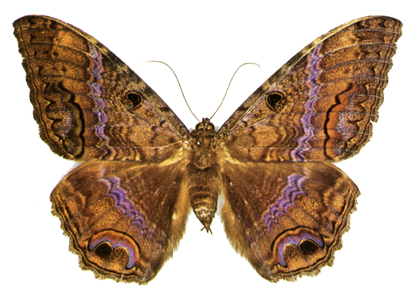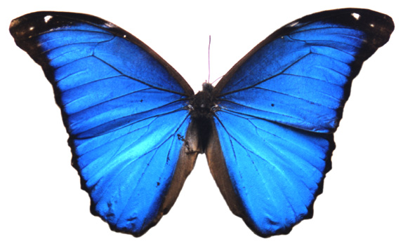 Morpho Fabricius, 1807: a genus in a subfamily of »Nymphalidae, the »Morphinae. It comprises some eighty large to very large tropical butterflies, occurring only in S and C America, especially in the Amazonas basin. In some of its species (often only the males), the upperside of the wings is of a striking and deep unicolored metallic blue, the famous Morpho lustre ("a harsh sheen") which is so incredible that old illustrators who colored the drawings usually rendered it too dark and dull; later, printers sometimes added a film of silver which missed the point as well, and even modern photography cannot quite cope with the metallic blue as it blazes in the tropical sun. The colors are so-called structural ones, made without pigments, only by the refraction of the scales, and hence permanent. They serve a purpose: when flying high above or among the treetops of the rain forest as Morphos usually do, their bright reflections blind birds that may want to attack them. The undersides usually are of a dull brown with eyespots, so as soon as the Morpho settles down it becomes quite inconspicuous and seems to disappear. For use in Brazilian handicrafts (plates, trays, night-blue pictures), some of these butterflies which are swift flyers and difficult to catch are raised in Morpho farms. Formerly they used to be caught by convicts. Feltwell: "About six million specimens are taken annually, but this does not appear to have affected population levels." The species most commonly used for butterfly handicrafts is the Brazilian Morpho (Morpho aega Hübner, 1822), with a wingspan of 80–90 mm. "… if I use 'morpho blue' I am thinking not of one of the many species of variously blue Morpho butterflies of South America, but of the ornaments made of bits of the showy wings of the commoner species" (Nabokov in a letter to Alfred Appel, Jr., April 3, 1967 – SelLet 411). The phrase "broken like Morphos" in Pnin (p. 92) probably refers to their commercial dismemberment. The information supplied in Look at the Harlequins! (p. 67) does not quite suffice to identify the four Morphos on display. The two big ones might be the Blue Morpho (Morpho menelaus Linnaeus, 1758) and Cramer's Blue Morpho (Morpho rhetenor Cramer, 1775), both with a wingspan of c. 140 mm, the less metallic looking one with white lines The Morpho (Morpho cypris Westwood, 1847), wingspan c. 105 mm, the one gleaming "like silvery satin" the Mother-of-Pearl Morpho (Morpho laertes Drury, 1770, wingspan c. 100 mm. In Look at the Harlequins! (p. 156), there also is "a sedate Bellargus sedan of a celestial blue that Bel was to compare with that of a Morpho". Indeed, the celestial blue of the Adonis Blue (»Polyommatus bellargus) is a structural color, as is that of the Morphos. When Nabokov gave butterfly names to cars ('Icarus,' 'Argus,' 'Bellargus'), it very probably was as a hint to their color. Since Nabokov's death, automobile manufacturers have actually produced car paints that imitate the structural colors of butterflies. *Stor:Aur 244, 250; BendSin 227; Pnin 92; Ada 551; LHarl 67, 156; SelLet 410–411, 468, 562