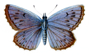 Maculinea (ex Lycaena, Phengaris) rebeli Hirschke, 1904 [Lycaenidae, Polyommatinae]: one of the ant blues which in their caterpillar stage live in ant nests. The blue in its males is without the frequent violet tinge; it has broad black margins. It is found locally on dry mountain meadows in N Spain, Italy, SC and SE Europe, but especially in the Massif Central of France and in the French Alps. *StrOps 332 & Ac: Maculínea rébeli • Fr: l'azuré de la croisette, l'azuré de Rebel • Ge: (Rebels) Kreuzenzianbläuling