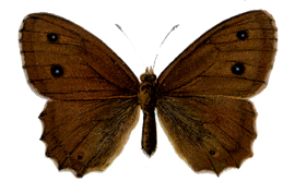 *Minois (ex Enodia, Satyrus) dryas Scopoli, 1763 [Nymphalidae, Satyrinae, Satyrini]: a satyrine with a wingspan of 45–60 mm. In flight it appears to be entirely black. However, in the females there are two blue eyespots on each of its forewings. It used to fly in temperate Eurasia from SW Europe to Japan, up to 1,500 metres, on open and woodland meadows; in Europe, it is on the decline. *Glory 86; Lep1 32 & Ac: Mínois drýas • En: Dryad • Fr: le grand nègre des bois • Ge: Blauäugiger Waldportier • It: driade • Ru: сатир Дриада, бархатница дриада • Sp: ojos azules