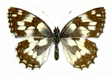 Melanargia (ex Agapetes) galathea Linnaeus, 1758 [Nymphalidae, Satyrinae]: a satyrine with a wingspan of 37–52 mm, distinguished from most others by its basically white wings "chequered" a dark brown. It is common on grassy, flowery and bushy places in NW Africa, W, C and SC Europe across Asia Minor to S. Urals and N Iran, but absent from large areas within its main region of distribution. "Extremely abundant in some places, such as hayfields in the Alps, where it flutters from flower to flower; up to about 1500 m. in Switzerland but to much greater altitudes when indulging in the half-hearted migratory flights which I have observed in the case of this species …" *SelLet 287; NabBut 527 (L), 594–5 (BE); Lep1 32; Lep2 270 & Ac: Melanárgia/Agapétes galathéa • En: (Galatea) Marbled White • Fr: le demi-deuil • Ge: Schachbrett, Damenbrett, Brettspielfalter • It: melanargia, galatea • Ru: пестроглазка Галатея, (DarII) Галатея • Sp: medioluto norteña