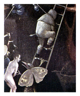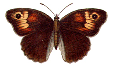 Maniola (ex Epinephele, Erebia) jurtina Linnaeus, 1758, syn janira Linnaeus, 1758 [Nymphalidae, Satyrinae, Maniolini]: a very common butterfly from the Canary Islands and NW Africa through most of Europe and Asia Minor to Iraq, iran and W Siberia. Its wingspan is 40–48 mm. M. jurtina is medium brown and orange and has a black ringed eyespot in the apex of the forewings. Nabokov (in a letter to Life, 12 Nov 1949) identified the butterfly wings in the center of the right-hand panel of Bosch's "Garden of Delights" as belonging to the female of Maniola jurtina. Its steely wings will be found in the right-hand panel ("Hell") at the bottom of the ladder leading up to the cave in the viscera; they seem to serve one of hell's armored animals as mock-angelic wings. *LaughD 201; StrOps 60; Ada 436; SelLet 93–94; NabBut 625 (I); Lep1 32; Lep2 270 & Ac: Maníola/Epinéphele jurtína • En: Meadow Brown • Fr: le myrtil • Ge: Kuhauge, Großes Ochsenauge • It: iurtina • Ru: бархатница волоокая • Sp: loba