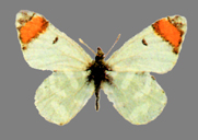 Orange-tip: generally, all marbled or white »pierids having an orange mark in the apex of the forewings. They used to form a subfamily of their own, the Anthocharinae, but are now ranged with Pierinae. The European genera are Anthocharis Boisduval, Rambur & Graslin, 1833, Microzegris Alphéraky, 1913, Pontia Fabricius, 1807 and Zegris Boisduval, 1836 [Pieridae]. The European Orange-tip par excellence is »Anthocharis cardamines.