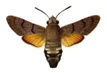 Macroglossum stellatarum Linnaeus, 1758 [Sphingidae, Macroglossinae]: a migratory day-flying hawk moth that breeds in the warmer parts of the Palearctic and then proceeds north. It is such an exceptional flyer that it may even reach the polar zone. As the pupa does not stand freezing temperatures, it will only accidentally survive the winter in the colder zones; next year, the northerly population will be made up of new migrants. The wingspan is 40–50 mm. The tip of its abdomen resembles a short and chubby tail. The Hummingbird Moth darts from flower to flower, sucking nectar with its long proboscis while hovering over it. It is found all over Europe, N Africa and Asia; recently it also reached N America. Karges (1985) believes the reference in Speak, Memory ("the vibrational halo around the streamlined body of an olive and pink Hummingbird moth poised in the air above the corolla") to be to all hawk moths that hover like hummingbirds and for no apparent reason identifies this particular one as Proserpinus proserpina Pallas, 1772. If so, 'Hummingbird' would hardly have been capitalized. *Gift 133; SpeakM 134; Lol 157; Ada 510; N/WLet #231=191old; Lep2 255 & Ac: Macroglóssum stellatárum • En: Hummingbird Moth • Fr: le moro-sphinx • Ge: Taubenschwänzchen, Karpfenschwanz • It: sfinge del galio, passera dei morti • Ru: языкан мареновый • Sp: esfinge colibrí, esfinge moro & Ac: Prosérpinus prosérpina • En: Willowherb Hawk Moth • Fr: le sphinx de l'épilobe • Ge: Nachtkerzenschwärmer • Ru: бражник Прозерпина • Sp: esfinge proserpina