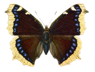 Nymphalis (ex Vanessa) antiopa Linnaeus, 1758 [Nymphalidae]: one of the beautiful and distinctive butterflies of the northern hemisphere. In Europe it can be found up to the northernmost tip of Norway. Its wingspan is 56–80 mm. On the upperside the wings are maroon with a ragged yellow margin, bordered inwardly by bright azure spots. The underside is purposefully drab so it can merge with dark bark when the butterfly is resting. When disturbed, it will start off very briskly, producing a clicking sound. The English name derives from the village of Camberwell near which the first specimen was taken in the 18th century. "Throughout the Palearctic, except England and the Mediterranean islands, especially abundant in the birchwoods of the North; much less so among the willows of southern streams. Ranges southward to N. Africa and eastward to N. India and Japan. Widely distributed but not particularly common in the Nearctic … 'Rarity' among butterflies works in inverse ratio to size, and if antiopa were not bigger than a blue it would be considered rare in Switzerland or S. France" ("Butterflies of Europe", 1964). On a postcard picturing this butterfly, Nabokov wrote to his sister Elena (September 1970): We are distinguished by wings of black hue, wine-iridescence, and granules of blue following yellowish, crenulate borders. Copses of birch are our favorite quarters. (Translation by Dmitri Nabokov) In the early twenties, Nabokov addressed one of his poems of exile to this butterfly ("Babochka" [The Butterfly] in Gorniy put'): Velvety black, with the warm glow of a ripe plum, here it opened wide; through this live velvet delightfully gleams a row of cornflower-azure grains, along a circular fringe, yellow as the rippling rye. It has perched on a trunk, and its jagged tender wings breathe, now pressing themselves to bark, now turning toward the rays … Oh, how they exult, how divinely they shimmer! One would say: a blue-eyed night is framed by two pale-yellow dawns. Greetings, oh greetings, reverie of a northern birch grove! Thrill, laughter, and love of my eternal youth. Yes, I'll recognize you in a Seraph at the wondrous meeting, I'll recognize your wings, their sacrosanct design. (Translation from the Russian by Gavriel Shapiro and Dmitri Nabokov) *Stikhi 60; Stor:Xmas 135; Mary 60; SebKn 137; SpeakM 231, 239; Ada 170; SelLet 473; NabBut 206 (FB), 398 (L), 495 (L), 596 (BE); Lep2 256, 268; Lep16; LtVé 193 & Ac: Nymphális/Vanéssa antíopa • Am: Mourning Cloak • En: Camberwell Beauty, Grand Surprise • Fr: le morio • Ge: Trauermantel • It: antiopa • Ru: нимфа Антиопа, (DarII) траурница • Sp: antiopa