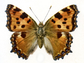 Nymphalis (ex Eugonia, Vanessa) polychloros Linnaeus, 1758 [Nymphalidae]: a pretty Palearctic nymphalid of temperate Eurasia and N Africa, absent in N Europe. It is reddish brown, with bold black, yellow and/or white marks and blue crescents along the borders of fore- and hindwings. The wingspan is 50 to 55 mm. Either this or »Aglais urticae, the Small Tortoiseshell (which is similar in appearance, but smaller) must be the butterfly in Cincinnatus' cell that a spider has partly eaten. *Possibly InvBeh 119; SpeakM 128; possibly Ada 436–437; NabBut 603 (BE); Lep1 31; Lep2 255 & Ac: Nymphális/Eugónia/Vanéssa polychlóros • En: Large Tortoiseshell • Fr: la grande tortue • Ge: Großer Fuchs • It: vanessa multicolore • Ru: нимфа многоцветная, многоцветница • Sp: olmera, mariposa de los olmos