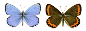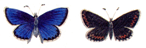 Plebejus (ex Lycaeides) idas Linnaeus, 1761, syn argyrognomon Bergsträsser, 1779 [Lycaenidae]: a Holarctic blue called Northern Blue in America and Idas Blue in Europe. For the change of specific name, see »Plebejus argyrognomon; for the change of generic name, see »Plebejus and »Lycaenidae. The Northern Blue is one of the two Orange-margined Blues of America, the other one being »Lycaeides melissa, the Melissa Blue. The two species are the only N American representatives of the former genus »Lycaeides. They are both of the same size, with a wingspan of 22 to 32 mm. The females of both species are gray-brown, often glossed with blue or grading into blue near the thorax, with a characteristic submarginal band of bright orange lunulae (which is wider in the Melissa Blue) to which they owe their collective common name. The males of the Northern Blue are of an iridescent violet blue, with a narrow black border and a white fringe. The Northern Blue prefers cool zones in western mountains, open areas, heaths and bogs in coniferous or mixed forests. Its range in America is from Alaska to the mid-Californian mountains and to S Colorado. In Eurasia, the range of idas is most of Europe (unlike that of argyrognomon also W and N Europe), Turkey, the Middle East and Asia. Lep7 argues that idas is derived phylogenetically from Lycaeides agnata Staudinger, 1889 of C Asia. In his first scientific paper on lycaenids (Lep7), Nabokov argued that the N American forms of the genus Lycaeides Hübner fall in three main groups, clustering around the species argyrognomon (= idas), scudderi and melissa. In the idas group, there is the subspecies anna and another one with "fawn or whitish fawn underside" that may require a name of its own but has not yet received one. In his ultimate work on the genus (Lep14), Nabokov distinguished ten intergrading subspecies of N American argyrognomon (= idas): a "western array" consisting of anna, lotis and ricei, a "northern or transcontinental array" (alaskensis, scudderi, aster) and a "Rocky Mountains array" (ferniensis, atrapraetextus, longinus, sublivens). *StrOps 331; NabBut 577 (BE) & Ac: Lycáeides ídas • Am: Northern Blue • En: Idas Blue • Fr: l'azuré du genêt • Ge: Ginsterbläuling, Gemeiner Bläuling • Ru: голубянка переливчатая, голубянка Идас • Sp: niña esmaltada