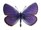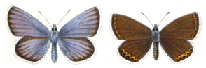 Plebejus argus Linnaeus, 1758, syn aegon Denis & Schiffermüller, 1775 [Lycaenidae]: a Palearctic blue with a wingspan of 20–23 mm. In the males, the wings are a very deep, purplish blue. In the females, they are brown with marginal orange spots. It flies over grasslands and heaths from W Europe across temperate Asia and Siberia to Japan. *Ada 551; NabBut 309, 577 (BE); Lep1 30; Lep2 270; Lep8 105, 129; Lep9 2; Lep14 484, 528 & Ac: Plebéjus árgus • En: Silver-studded Blue • Fr: l'azuré de l'ajonc • Ge: Geißkleebläuling • Ja: Himeshijimi • Ru: голубянка Аргус • Sp: niña hocecillas