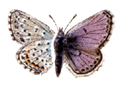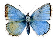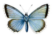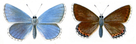 Polyommatus (ex Plebejus, Lycaena) icarus Rottemburg, 1775 [Lycaenidae]: one of the commonest Palearctic blues, ranging from grassy areas of Europe across temperate Asia to the Pacific coast; it is also found in N Africa. The males are a bright violet-blue with a black border, the females are brown with orange spots along the margins. The wingspan is 25–30 mm, the females are smaller. "It is very sensitive to climatic conditions; and seasonal forms cut across local ones in a most haphazard way. We can speak of racial tendencies rather than of true subspecies, and it is from this point that a number of the 'races' described by Verity should be viewed" (notes for "The Butterflies of Europe", 1964). Polyommatus icarus was first described by Rottemburg in 1775 as Papilio icarus. As Hemming points out, Latreille who in 1804 established the genus Polyommatus and made icarus its type-species as well as other lepidopterists of his time seem to have confused icarus with Papilio (now: »Plebejus) argus Linnaeus, 1758. As the type-species of the genus, icarus is something like the prototype of all the polyommatines (»Lycaenidae), the group of butterflies Nabokov did most of his scientific work on. This, of course, is not because icarus is more Polyommatus-like than all the others but for purely entomohistorical reasons. In the Russian Lolita, the car on p. 254 of the English version is called an 'Ikarus'. In Ada, there is a car by the name of 'Argus'. Possibly these names for two cars are a reference to two particular shades of butterfly blue. Between 1965 and 1971, Nabokov captured 55 specimens in Switzerland, France, Italy and Portugal. The name 'polyommatus' means 'the many-eyed one'. The name refers to the many small ringed spots on the undersides of the wings. *Lol 254; NabBut 208 (NB), 577 (BE), 609 (BE); Lep1 30; Lep2 257, 268; Lep4 267 & Ac: Polyómmatus ícarus • En: Common Blue • Fr: l'argus bleu commun • Ge: Hauhechelbläuling • Ru: голубянка Икар, (DarII) икар • Sp: ícaro, dos puntos
