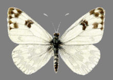 Pontia (ex Pieris) occidentalis Reakirt, 1866 [Pieridae], referred to by Nabokov as 'Pieris' callidice occidentalis Reak.: one of the butterflies encountered by Nabokov in August, 1949, at Jackson Hole. Pontia occidentalis is a N American white similar to the Palaearctic Pontia callidice Hübner, 1799 of the Pyrenees, the Alps, Asia Minor, Tibet, the Himalayas and Mongolia. It is unclear how the two species are related and if the American one should be considered a subspecies of the Old World one; the prevailing opinion seems to be that it is a species of its own. Its range is Alaska to Manitoba and south to C California and New Mexico. *Lep16 & Ac: Póntia callídice • En: Peak White • Fr: le veiné-de-vert, le marbré des alpages • Ge: Alpenweißling • Sp: blanquiverdosa alpina & Ac: Póntia/Píeris (callídice) occidentális • Am: Western (Chequered) White
