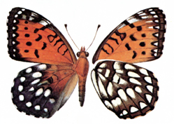 Speyeria (ex Argynnis) atlantis W.H. Edwards, 1862 [Nymphalidae]: the Atlantis Fritillary (or Mountain Silverspot), a N American fritillary which Kinbote, along with a Diana (»Speyeria diana), takes for a flower. Its range is from the Maritime Provinces to West Virginia and westward to Alaska. The wingspan is 44–67 mm. *PaleF 169; NabBut 398 (L), 405 (L)