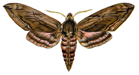 Sphingidae Latreille, 1802: a family of small to large moths, comprising around 1,000 species, most of them in the tropics. Their bodies are strong, and they have excellent flying capabilities, some of them reaching 50 kmh. They have big eyes and long trunks, allowing them to suck nectar from flowers as they hover over them, hummingbird fashion. Many of them fly at dusk. The type-species is Sphinx ligustri LINNAEUS, 1758, the Privet Hawk Moth. *NabBut 205 (FB), 268 (L); LtVé 466 & Ac: Sphíngidae • En: sphingids, hawks, hawk moths, sphinx moths • Fr: sphingidés, sphinx • Ge: Sphingiden, Schwärmer • It: sfìngidi • Ru: бражники, (DarII) свингиды • Sp: esfíngidos