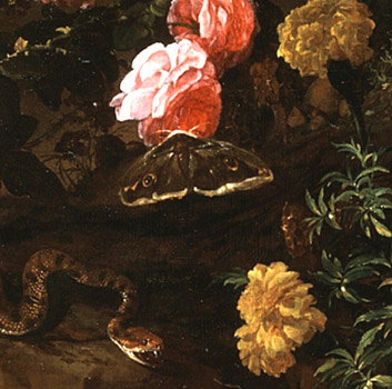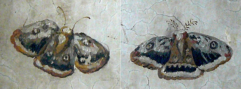 Saturnia pyri Denis & Schiffermüller, 1775 [Saturniidae]: the Peacock Moth, an emperor moth and the largest Lepidopteron in the warmer parts of Europe, W Asia and N Africa, with a wingspan of 100–130 mm. The wings have a wavy brownish, blackish and ocher pattern, usually with much chocolate brown, and a pale outer marginal band. There is a brown, red and black ringed eyespot on each wing. It flies only by night, circling around street lanterns and resembling a bird or a bat. It does not eat, living only as long as the fat reserves last. The Peacock Moth flies from late April to early June. There is just one brood. The large green caterpillar with blue knobs (length 80 mm, diameter 20 mm) lives in orchards and feeds on the leaves of apple and pear trees. The pupa overwinters. (Latin pirum or pyrum is 'pear' and 'apple,' whence the name Pear Peacock in Ada.) This is the moth that in Invitation to a Beheading so scares Cincinnatus' jailer Rodion: "It was as large as a man's hand; it had thick, dark-brown wings with a hoary lining and gray-dusted margins; each wing was adorned in the center with an eyespot, shining like steel. Its segmented limbs, in fluffy muffs, now unstuck themselves, and the upraised vanes of its wings, through whose underside the same staring spots and wavy gray pattern showed, oscillated slowly … its brown, white-dappled abdomen, its squirrel face, the black globules of its eyes and its feathery antennae resembling pointed ears." Gennady Barabtarlo identified this insect as "a female of the Emperor Moth, »Saturnia pavonia Linnaeus, the largest European moth" (Slavic Review, 49 [3], Fall 1990, p. 390–397). Though the description does in some ways fit pavonia as well as pyri, pavonia is by no means the largest European moth. Saturnia pavonia's wingspan is just about half of that of pyri, and thus it is not nearly "as large as a man's hand". Also the overall color is not dark-brown but gray and brown. In a letter to Alfred Appel, Jr., Nabokov confirmed that is was Saturnia pyri. Karges (1985) tentatively identifies the Peacock Moth in "Lines Written in Oregon" as »Antheraea polyphemus Cramer, 1776 [Saturniidae], and that it could be, being the commonest of all N American Saturniids, present in ten counties of Oregon. Saturnia pyri is strictly Palearctic and does not fly in America. In Ada (II,7), there is a paragraph on a Renaissance painting of the Peacock Moth. Ada and Van, reunited for a while, are looking at a photo album they have from an alleged blackmailer. The snapshots were taken about eight years before in Ardis manor and park; some show young Ada and Van in compromising attitudes. This is one of them: "Two huge common Peacock moths, still connected. Grooms and gardeners brought Ada that species every blessed year; which, in a way, reminds us of you, sweet Marco d'Andrea, or you, red-haired Domenico Benci, or you, dark and broody Giovanni del Brina (who thought they were bats) or the one I dare not mention (because it is Lucette's scholarly contribution – so easily botched after the scholar's death) who likewise might have picked up, at the foot of an orchard wall, not overhung with not-yet-imported wisteria (her half-sister's addition), on a May morning in 1542, near Florence, a pair of the Pear Peacock in copula, the male with the feathery antennae, the female with the plain threads, to depict them faithfully (among wretched, unvisualized insects) on one side of a fenestral niche in the so-called 'Elements Room' of the Palazzo Vecchio." The painting is there, in the Palazzo Vecchio of Florence, on the second floor. The Elements Room (Quartiere degli Elementi) is one of several rooms of the "new quarters" in the back of the Palace. It has its name from the allegorical paintings of the four elements that adorn three of its walls and its ceiling. There are three windows, all opening on the Via di Ninna. On the right hand side of the middle window niche there are two Peacock Moths, both about natural size, that is about 110 mm wide. They are about 30 cm apart and not in copula. But if the painter noticed that there is a difference between males and females and that it shows in the look of their antennae, somebody must have caught a pair in copula for him. The one on the right has featherlike (or plumose] antennae (the male), the left one has straight shafts (the female). In the same window niche there are eight other butterflies and dragonflies, all nondescript. So far there is no problem to the paragraph. The painting exists where it is said to exist, and there is no question as to which moths it depicts. The rest of the paragraph is less clear. It would be tempting to decide which was the scholarly name Lucette contributed and the author withheld. However, the three names given do not accord well enough with what is known about the genesis of the Elements Room to allow an easy solution. The Elements Room was decorated from 1555 to 1556 under the direction of the painter, architect and writer Giorgio Vasari (1511–1574). Vasari had left the Pope's service in 1554 to become court artist of Grand Duke Cosimo I di Medici. One of his first tasks was to completely refurbish the town palace in Florence. From the payrolls that still exist we know that he was aided by several assistants: the painters Cristofano di Guido Gherardi, known as 'Doceno' (born 1508 in Borgo San Sepolcro, died 1556 in Borgo San Sepolcro), Marco d'Andrea Marchetti da Faenza (1527?–1588), Bacco di Michele, Bartolomeo di Michele di Ridolfo, Domenico di Lorenzo di Benci (or Beceri) and Giovanni di Matteo del Brina (c. 1540–1599). Other assistants were the Venetian stucco worker Giovan Matteo di Niccolò, Giovanni di Zanobi who ground the colors and Mariotto di Francesco who applied the gold. They all were working simultaneously on several rooms of the new quarters, starting with the Elements Room. Gherardi and Marco da Faenza were mainly responsible for the fanciful earthy detail (ca