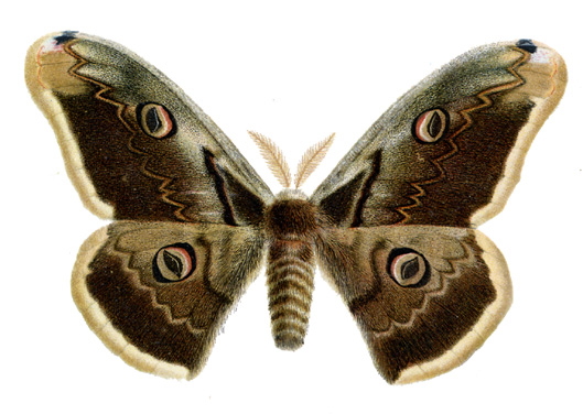 Saturnia (ex Eudia) pavonia Linnaeus, 1758 [Saturniidae]: a large, though not the largest European emperor moth with a wingspan of 40–68 mm in the males and 48–90 mm in the females, with a plump body. It is a smaller version of »Saturnia pyri, without the chocolate brown of that species. The basic color of the female is gray, while the hindwings of the male are of an orange brown. As with all saturniids, there is a striking dark eyespot on each wing. Its range is all over Europe and Asia, including the Amur and Ussuri basins. Robert Michael Pyle writes that the somnolent "semi-pavonian creature" of Nabokov's poem "In Paradise", written 1927 ("… a wild angel… Poke at it curiously / with your green umbrella") suggests Saturnia pavonia. The name most certainly does; but then paradise must have added a blue to its appearance that the original lacks. Cf. also »Automeris io. *SpeakM 121; NabBut possibly 107 (P), 123 & Ac: Satúrnia/Éudia pavónia • En: Emperor Moth • Fr: le petit paon de nuit, (Autres rivages) le Paon-de-nuit • Ge: Kleines Nachtpfauenauge • It: saturnia pavone / minore • Ru: павлиноглазка обыкновенная, мапая сатурния • Sp: pequeño pavón nocturno / de noche