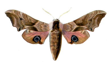 *Smerinthus ocellatus Linnaeus, 1758 [Sphingidae, Sphinginae]: For compositional more than for entomological reasons, it is likely that the three large moths mentioned in the course of Bend Sinister are the same species. The first time (p. 134) it appears in the hands of Krug's dead wife in a central scene of the novel that makes up all of Chapter 9 and strangely prefigures Ada. When she was fifteen and he eighteen, she found it in an orchard, carried it into the house (presumably her aunt's), carried it back and placed it in the lush grass at the foot of an apple tree. This is how it is described: "mouse-grey body," "short, red, blue-ocellated inferior wings," "long and marbled and deeply notched" superior wings, "shagreen caterpillar," "red hind wings basally". Its second appearance it makes on a plate in an early nineteenth-century insect book as "an ocellated hawk moth and its shagreen caterpillar" (p. 181). The third and last time is at the end of the book when the author has taken over, hears and sees a moth with furry feet clinging at the netting of his window and is going to pronounce the night good for mothing (p. 240–241). The only moth that is in agreement with all three descriptions including the red on the hindwings is Smerinthus ocellatus, the Eyed Hawk Moth, a pretty night-flying sphingid with a wingspan of 70–80 mm, marbled curved forewings and black-blue-black eyespots on the hindwings. In can be found in all of Europe and W Asia up to an altitude of 2,000 m, from May to July, often on weeping willows, poplars and apple trees. It should be noted that the moth Krug's wife had found in the garden in daytime and deposited there again might be the same species that visits the author at the end of the novel: "A big moth was clinging with furry feet to the netting, on the night's side; its marbled wings kept vibrating, its eyes glowed like two miniature coals. I had just time to make out its streamlined brownish-pink body and a twinned spot of colour; and then it let go and swung back into the warm damp darkness." In a letter to Alfred Appel, Jr. (July 27, 1967) Nabokov remembers, "there is another charming moth in bend sinister (cupped in a girl's hands)." *BendSin 133–134, 181, 240–241; NabBut 649 (L) & Ac: Smerínthus ocellátus • En: Eyed Hawk Moth • Fr: le sphinx demi-paon • Ge: Weidenschwärmer, Abendpfauenauge • It: smerìnto ocellato • Ru: бражник глазчатый • Sp: esfinge ocelada