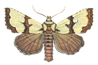 Shargacucullia (ex Cucullia) verbasci Linnaeus, 1758 [Noctuidae, Cuculliinae]: a Palearctic owlet moth with a conspicuous caterpillar: "porcelain-white and eyespotted", "… lovely, naked, shiny, gaudily spotted and streaked …, as poisonous as the mullein flowers clustering around them". Ranges through S and C Europe and N Africa. The species had been in the genus Cucullia Schrank, 1802 until in 1992 Ronkay & Ronkay placed it in their new genus Shargacucullia. All Cucullia moths are called Sharkmoths. *Ada 55, 56 & Ac: Shargacucúllia/Cucúllia verbásci • En: Monk Moth, Mullein Moth, Shark, Sharkmoth, Cowl • Fr: le brèche, (Ada) la Cucullie • Ge: Brauner Mönch, Wollkrauteule • It: cucullia • Ru: капюшонница коровяковая