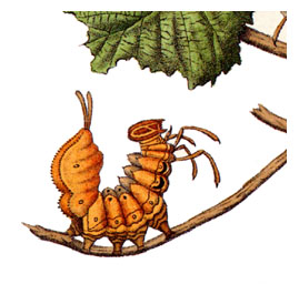 Stauropus fagi Linnaeus, 1758 [Notodontidae]: a prominent moth with a wingspan of 45–60 mm at home in the warmer parts of Europe and Asia. The caterpillars feed on oak, beech and lime and if occurring in masses may be a pest. About the mimetic tricks of the caterpillar Nabokov wrote: "… in infancy [it] looks like bird's dung, but after molting [it] develops scrabbly hymenopteroid appendages and baroque characteristics, allowing the extraordinary fellow to play two parts at once (like the actor in Oriental shows who becomes a pair of intertwisted wrestlers): that of a writhing larva and that of a big ant seemingly harrowing it." *SpeakM 124 & Ac: Staurópus fági • En: Lobster Moth, Lobster Prominent • Fr: l'écureuil, le bombyx du hêtre, l'harpye des hêtres • Ge: Buchenspinner • Ru: вилохвост буковый • Sp: guerrero del haya